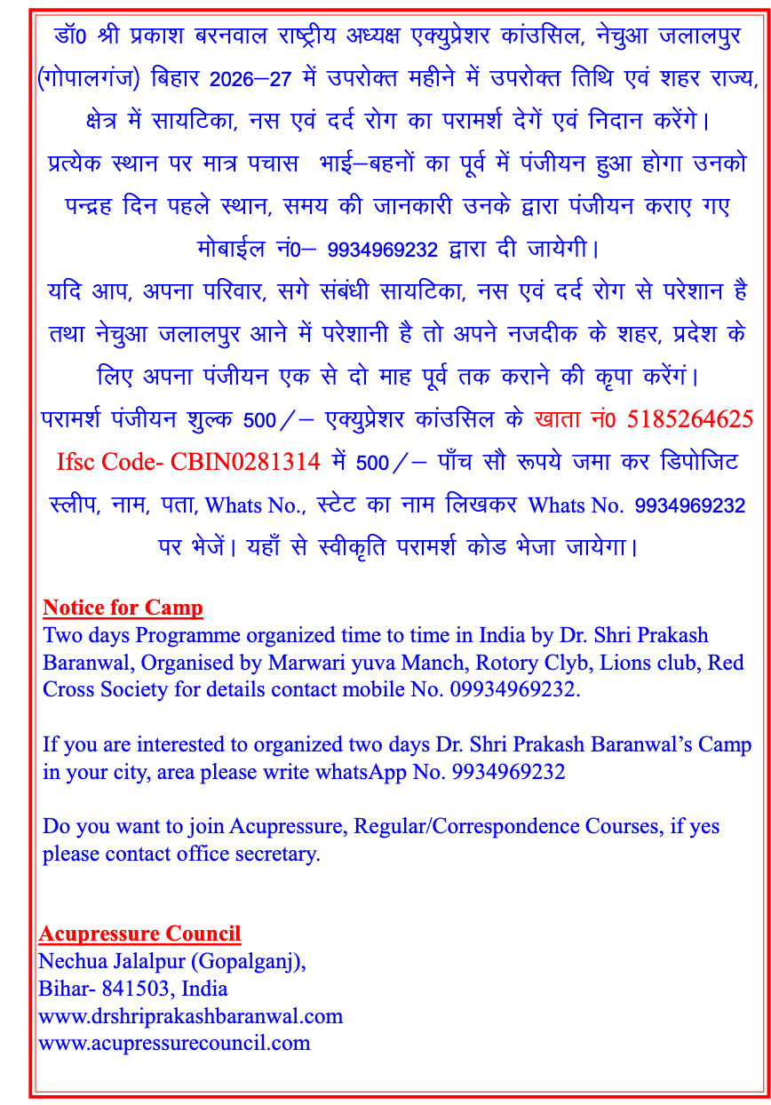 • If you are interested to organized two days Dr. Shree Prakash Baranwal camp in your city, area please write WhatsApp No-9934969232.