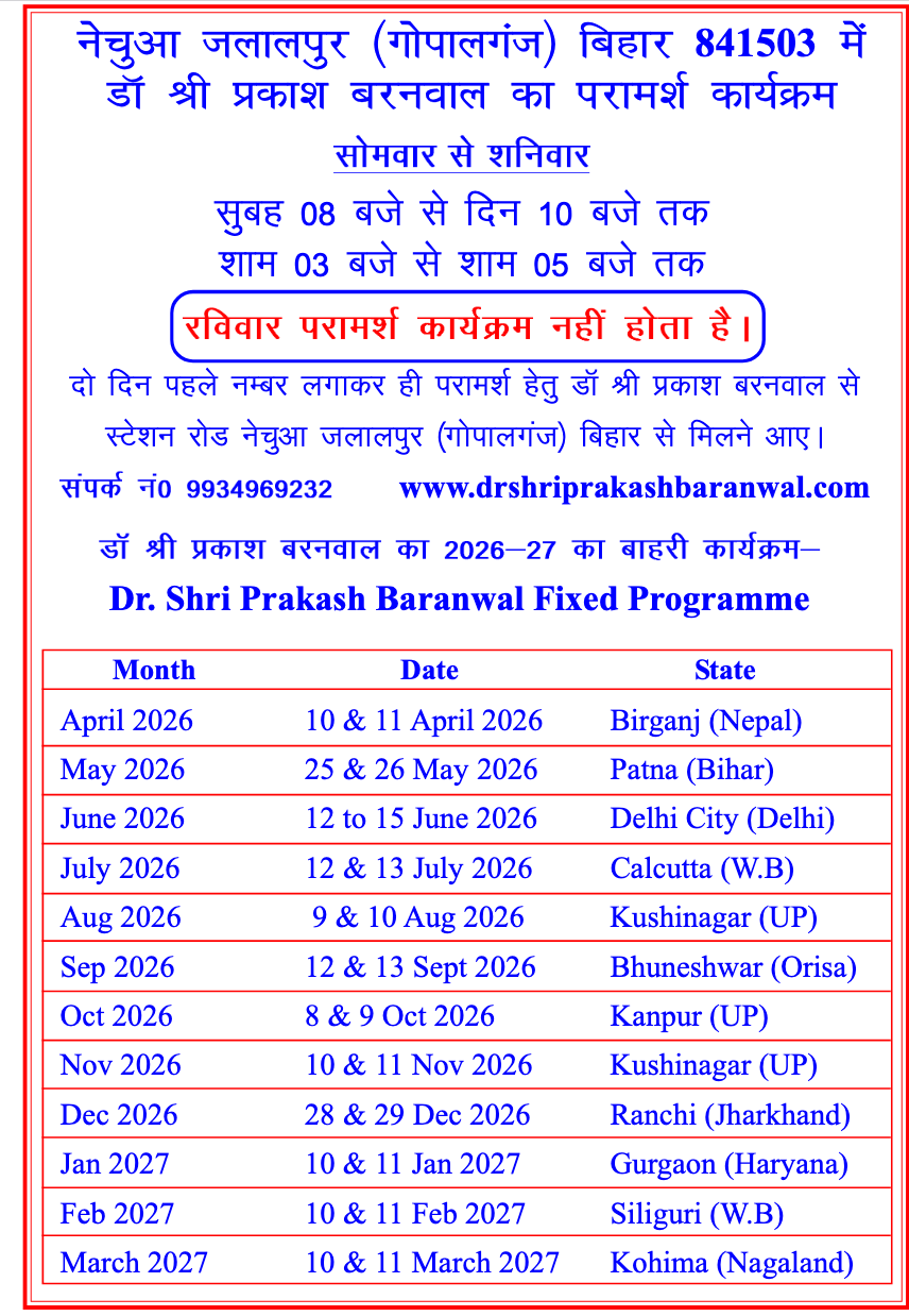 • If you are interested to organized two days Dr.Sri Prakash Baranwal’s camp in your city, area please write WhatsApps No-9934969232